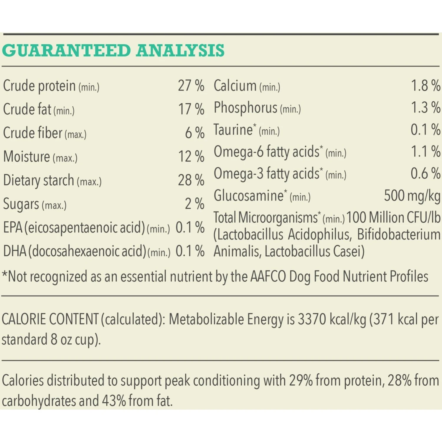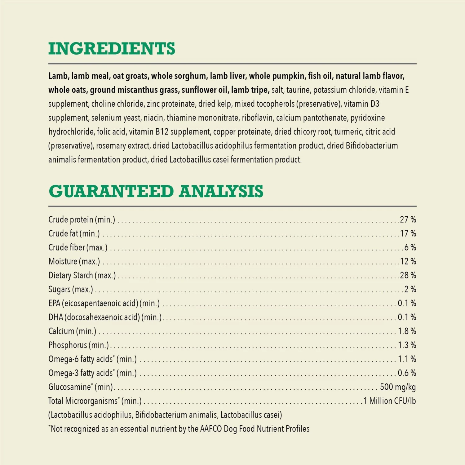 - Made with lamb protein for 60% animal ingredients and 40% wholesome grains, veggies, fruits, and nutrients.