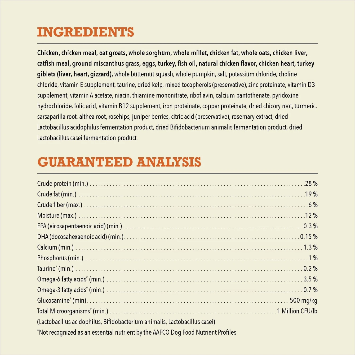 - Balanced with 65% animal ingredients and 35% wholesome grains, fruits, veggies, and nutrients.