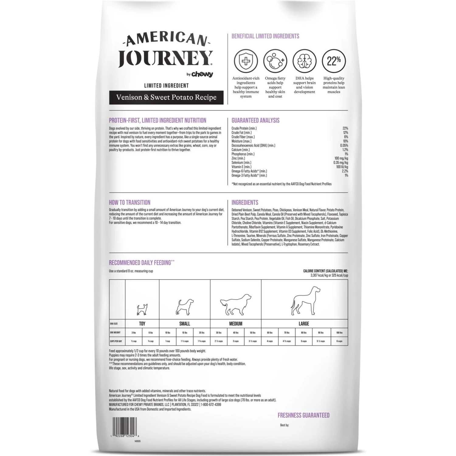 - American Journey Limited Ingredient Venison and Sweet Potato Recipe is made with venison as a single animal protein source, to support the needs of dogs with food sensitivities.