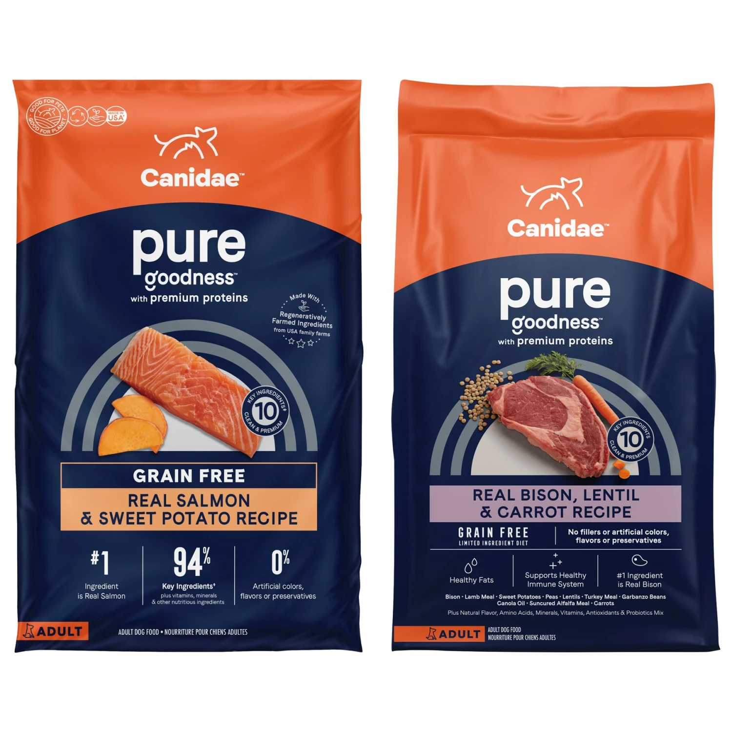 CANIDAE Grain-Free PURE Limited Ingredient Salmon & Sweet Potato Recipe Dry Dog Food, 22-lb bag—Spawn a new love for mealtime with the tasty, clean flavor of CANIDAE Grain-Free PURE Limited Ingredient Salmon & Sweet Potato Recipe Dry Dog Food. Formulated with just eight wholesome ingredients to nourish all canines—including those with sensitivities—this recipe boasts salmon as its first ingredient for a protein-packed meal your pup will love. Wholesome veggies provide him with a powerhouse of nutrition, while a blend of probiotics, antioxidants, fatty acids and vitamins and minerals support his vital systems and promote ongoing good health. With never any fillers or problem additives including corn, wheat, soy, grain or artificial ingredients, this fin-tastic salmon formula has everything your best buddy needs to thrive!