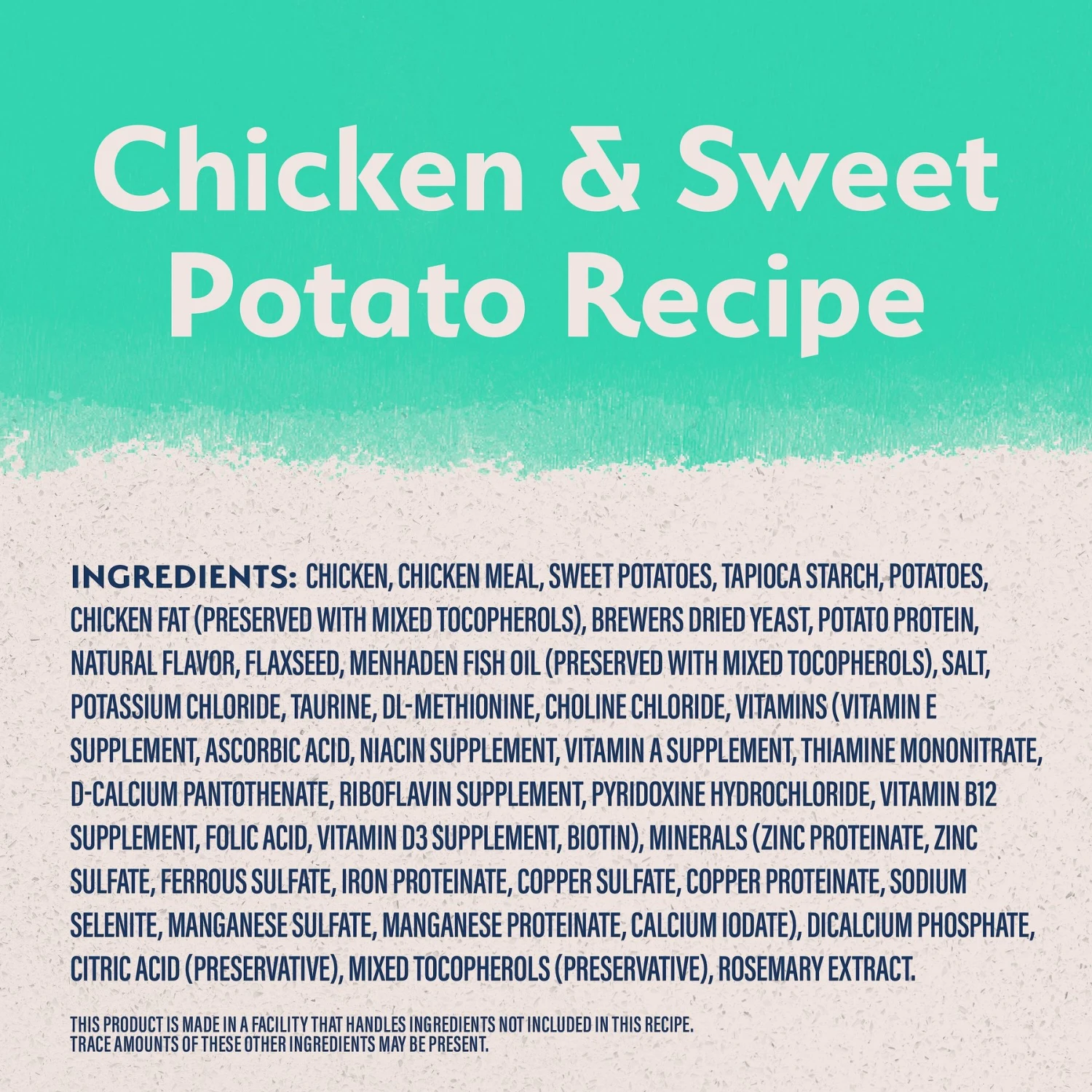 - Chicken is the first ingredient in this recipe, providing essential protein and amino acids to help maintain strong muscles, while sweet potatoes offer a grain-free source of fiber to support healthy digestion.