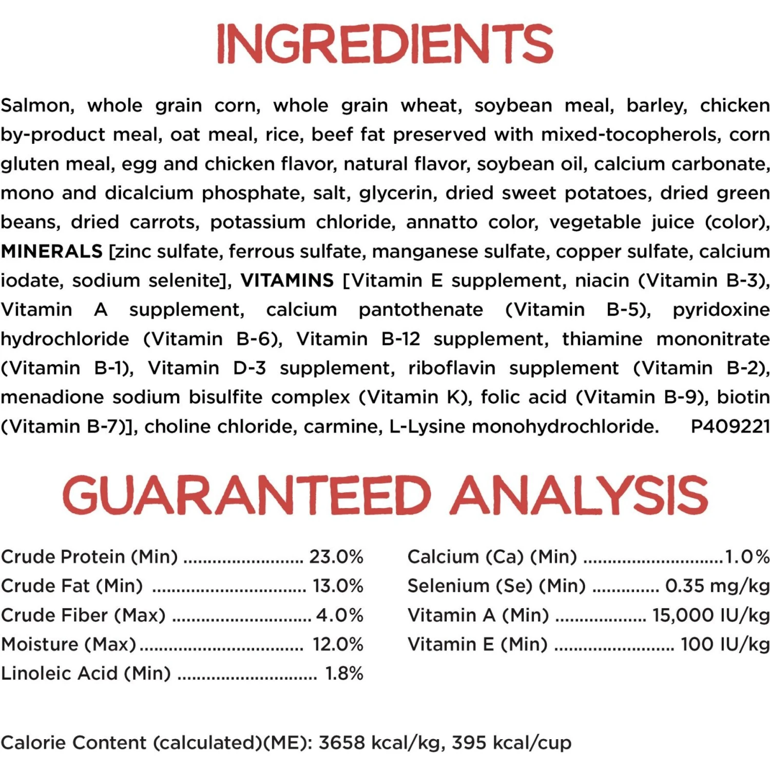 - Features natural salmon as the number one ingredient and this delicious premium food includes accents of real sweet potatoes, green beans and carrots.