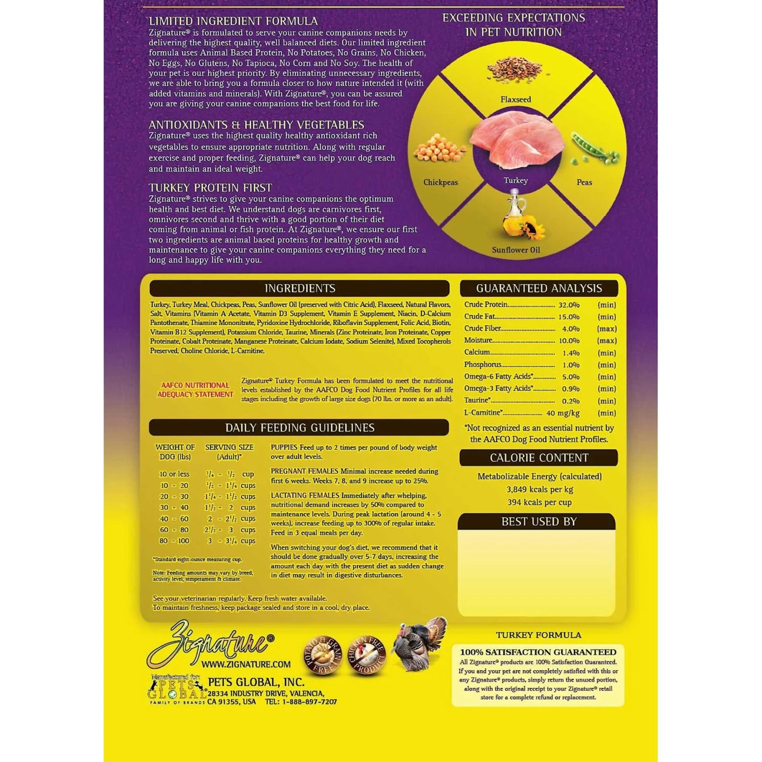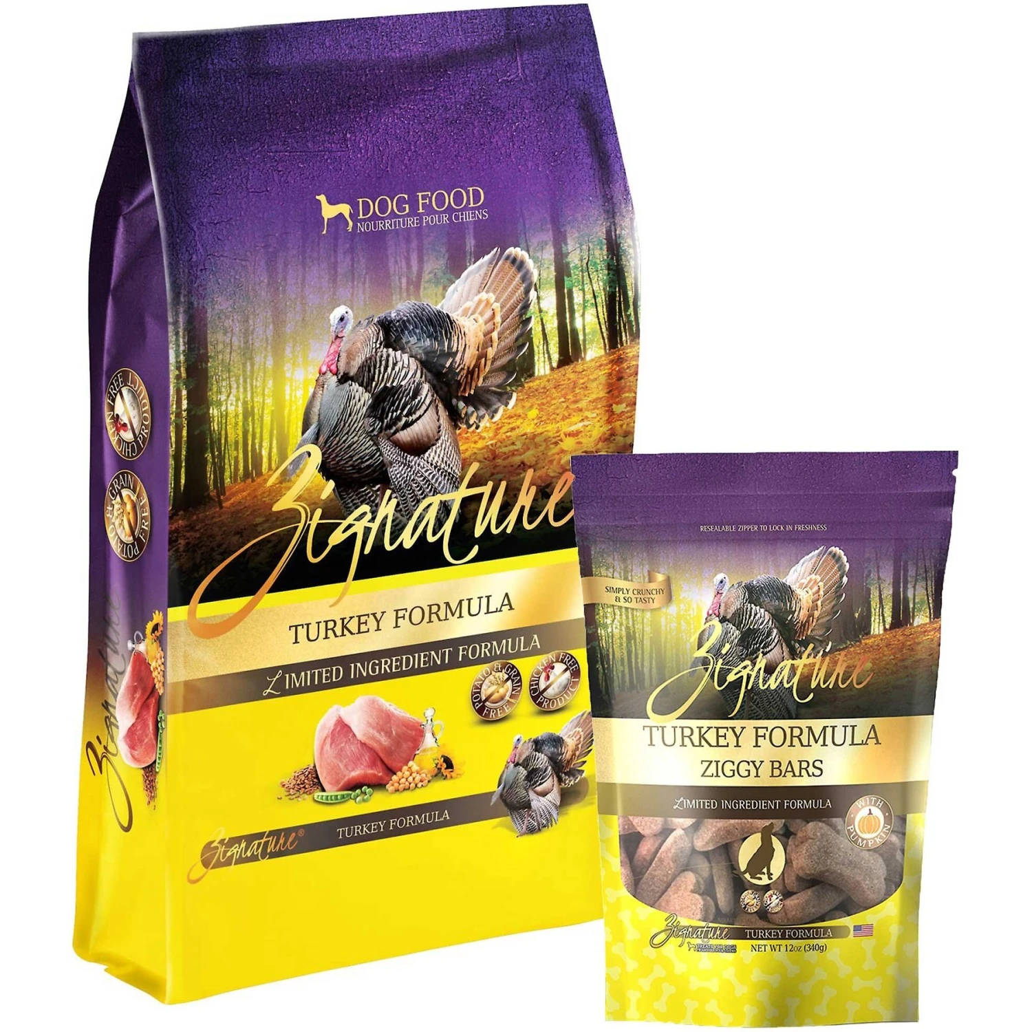 Fill your best friend’s bowl with wholesome nutrition when you feed them Zignature Turkey Limited Ingredient Formula Grain-Free Dry Dog Food + Grain-Free Turkey Formula Ziggy Bars Biscuit Dog Treats. This meat-first dry food recipe offers pups the protein they need to thrive, while Zignature’s limited ingredient recipe throws out troublesome ingredients like chicken, corn, wheat, soy, and potatoes, creating peak hypoallergenic, low-glycemic nutrition. Combine that with key antioxidants, essential fatty acids, and a complete spectrum of vitamins and minerals for a well-rounded meal that goes beyond nature to become your pet’s signature food for life. And, stuffed with vitamins and minerals and made with real turkey sourced straight from the American Midwest, the protein-filled Ziggy Bar treats are crafted to be easy on your dog’s sensitive stomach. The limited-ingredient formula also includes pumpkin, green lentils, garbanzo beans and red lentils for healthy, guilt-free rewarding!